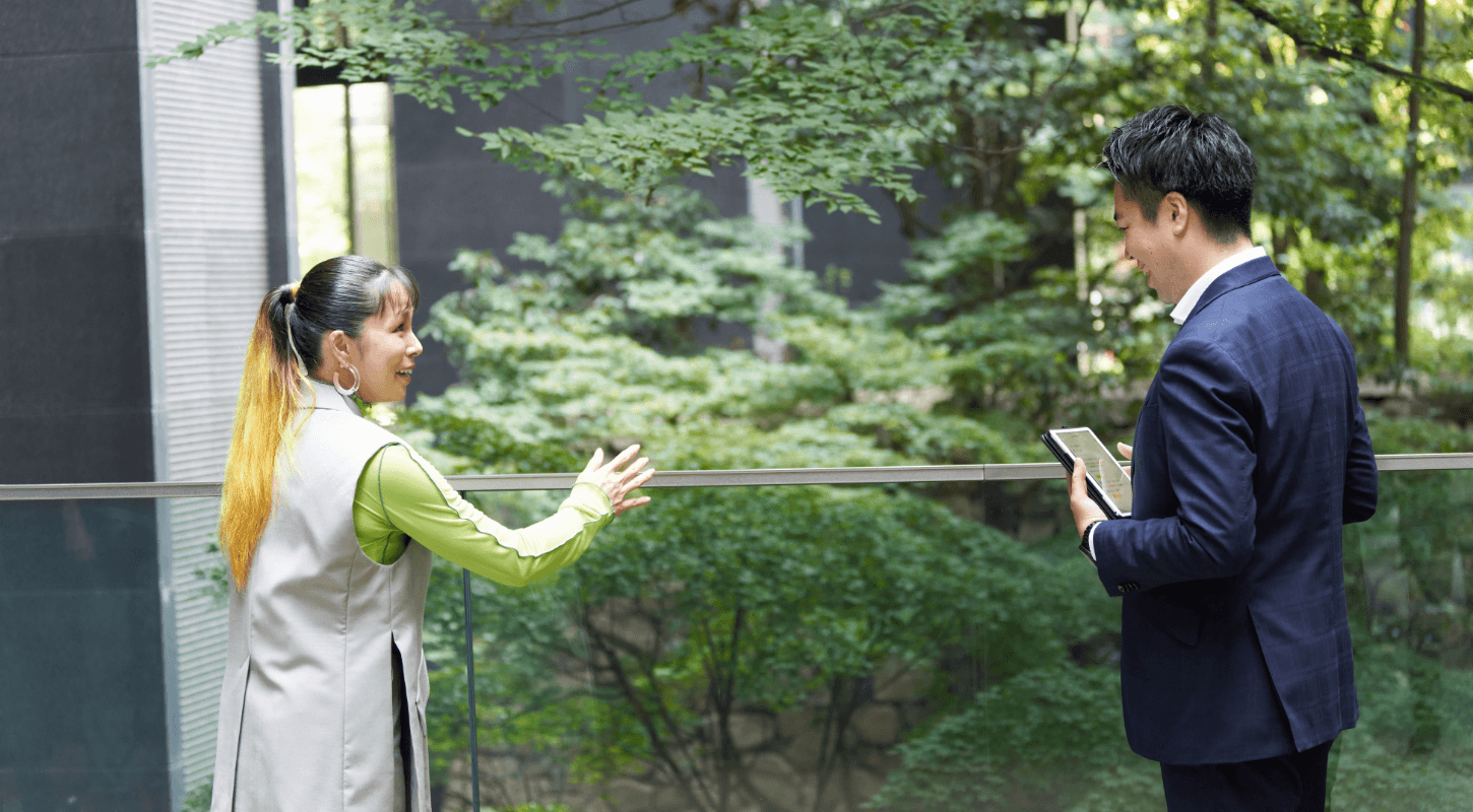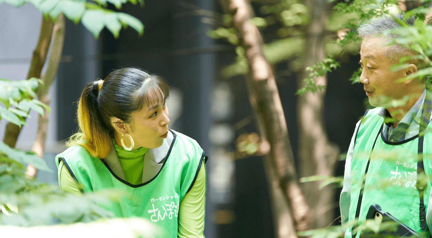 大手町の森では208種類の植物、129種の昆虫、13種類の鳥類が確認されています。生物の記録は大切な管理業務のひとつ。この日、AIさんは森を管理する東京グリーンサービスの福本和弘さんのガイドで特別に森の中へ。