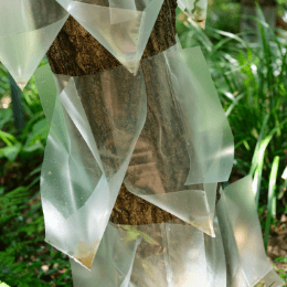定期的に下草刈りや樹木の剪定をしています。切った枝は園路の階段の土留にしたり、落ち葉を入れるバイオネスト(堆肥置き場)にしています。そこがまた生きものたちのすみかになるんですよ。困ったことに最近はカシノナガキクイムシによる伝染病によってナラ枯れの被害が出始めています。コナラやクヌギ・カシ類などの樹木が枯れてしまうので、トラップを設置して予防しています。ちょっと見た目は悪いですけど。