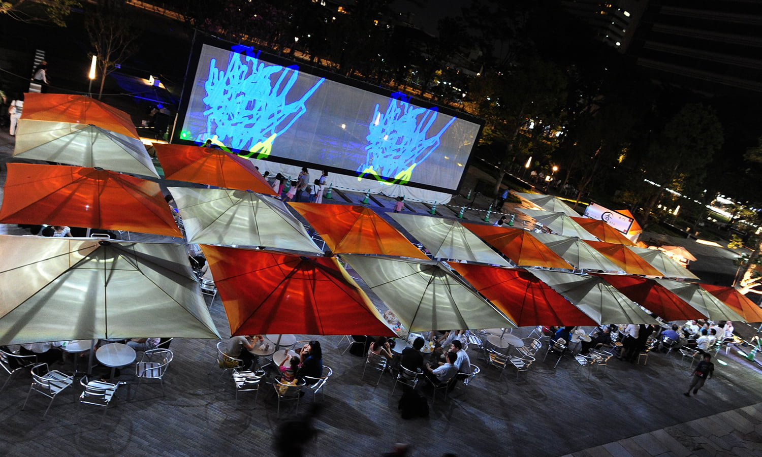 中野という土地柄、開発当初からオフィスワーカーだけでなく地元にも受け入れていただきたいという強い想いがあり、幅広い方々に愛着を持っていただけるよう、エリアマネジメント活動に注力しています。公園側に配置されたパークアベニューには約100本のパラソルを設置することができ、平日・休日を問わず中野に新たなにぎわいや交流を創出しています。