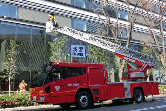 当社だけでなく、入居テナントと一体になって高い防災意識を継続することで、ハード・ソフトの両面から安心・安全で災害に強いまちづくりに取り組んでいます。