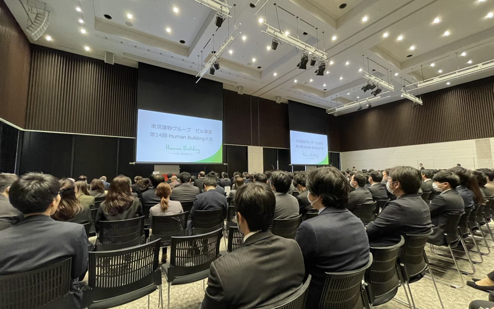 「Human Building」の取り組みとして注力しているのが、例年開催している『Human Building大会』と表彰制度です。グループのビル事業に関わる大勢の現場スタッフが一堂に会し、各現場の好事例を表彰して内容を共有します。優れた取り組みの水平展開や現場スタッフのモチベーション向上を目的に、2013年のインナーブランディング開始時より継続しています。表彰事例は関係者への取材をもとに制作した映像にて紹介し、現場担当者の想いや熱を伝えています。