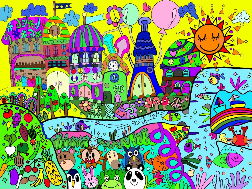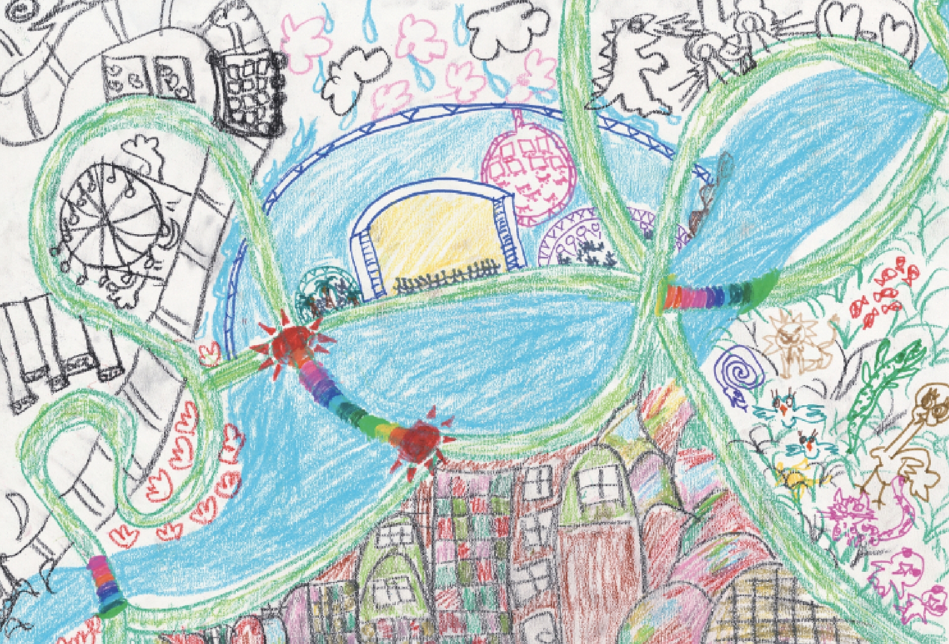まちを通る緑の道は広く、どんな人でも移動できます。中心には水に浮かぶライブハウスと、雨をためてできたエコな巨大プール。カラフルで色んな形の建物や、動物や植物のエリア、疲れた人用のリラクゼションルームもあります。わたしの夢と希望があふれる未来の理想のまちです。