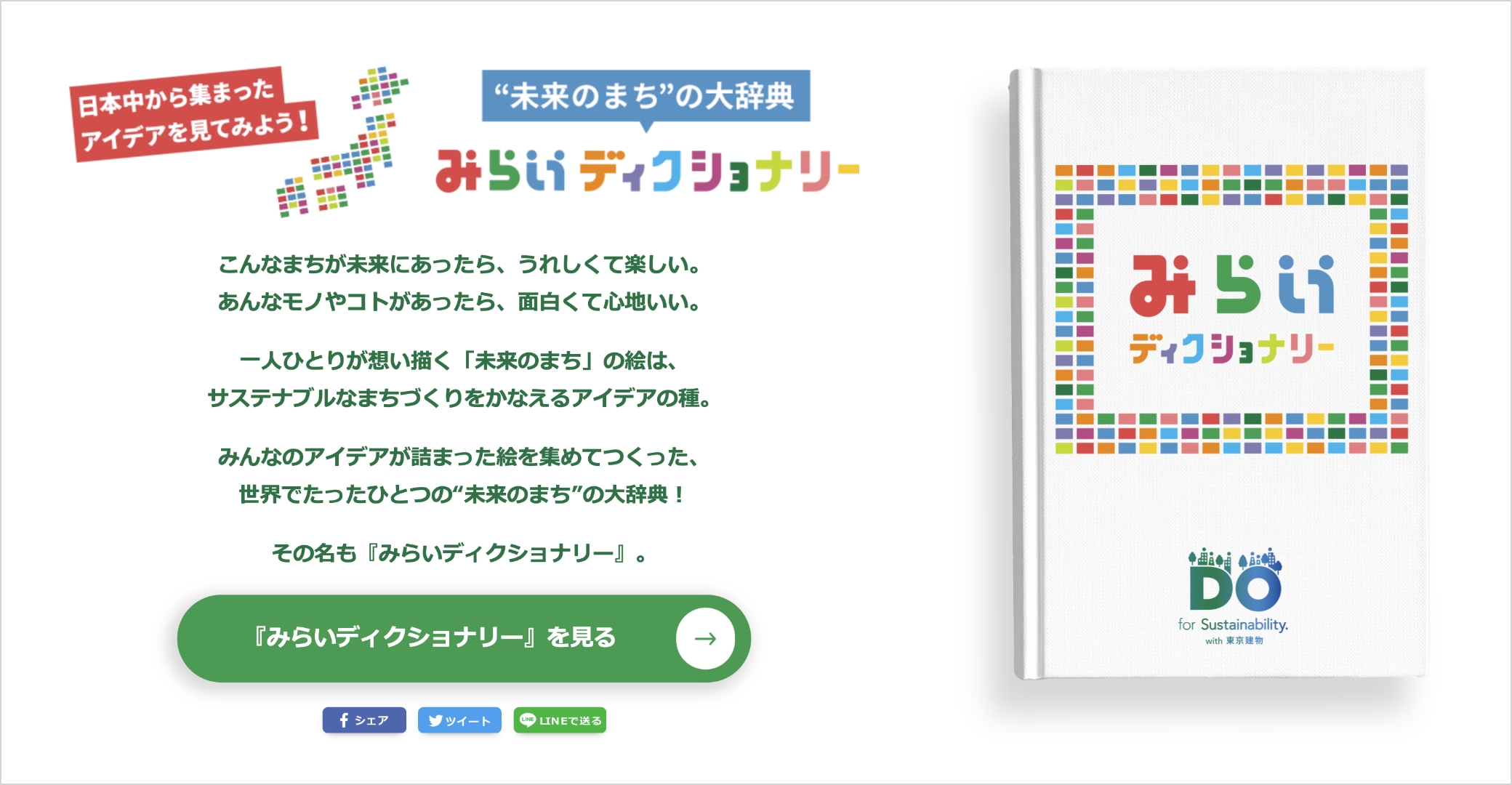『みらいディクショナリー』は 、まちに住まい、働き、集う、ひとりひとりの「あったらいいな」「こうなったらいいな」というまちや未来への希望・想いを詰め込んだ「未来のまち」の絵を、サステナブルなまちづくりをかなえるアイデアの種として集録した、世界でたったひとつの“未来のまち”の大辞典です。この企画は、AIさんがサステナビリティパートナーに就任した「DO for Sustainability. with 東京建物」発表会で披露した、コンセプトムービーをきっかけにスタート。AIさんとのコラボレーション第1弾であるコンセプトムービーの制作にあたり、東京建物グループ社員と家族、友人などまちづくりに関わるひとりひとりが描いた「未来のまち」の絵を集めて巨⼤なモニュメントをつくり上げました。そして第2弾企画として、「未来を描こう。」を合⾔葉に、⽇本全国から「未来のまち」をテーマに作品を募集。ひとりひとりがサステナブルについて考え⾏動するきっかけになるように、みんなで共有・シェアできるようにという願いを込めて、オンライン上で公開する『みらいディクショナリー』を制作、最終的に947作品が掲載されています。