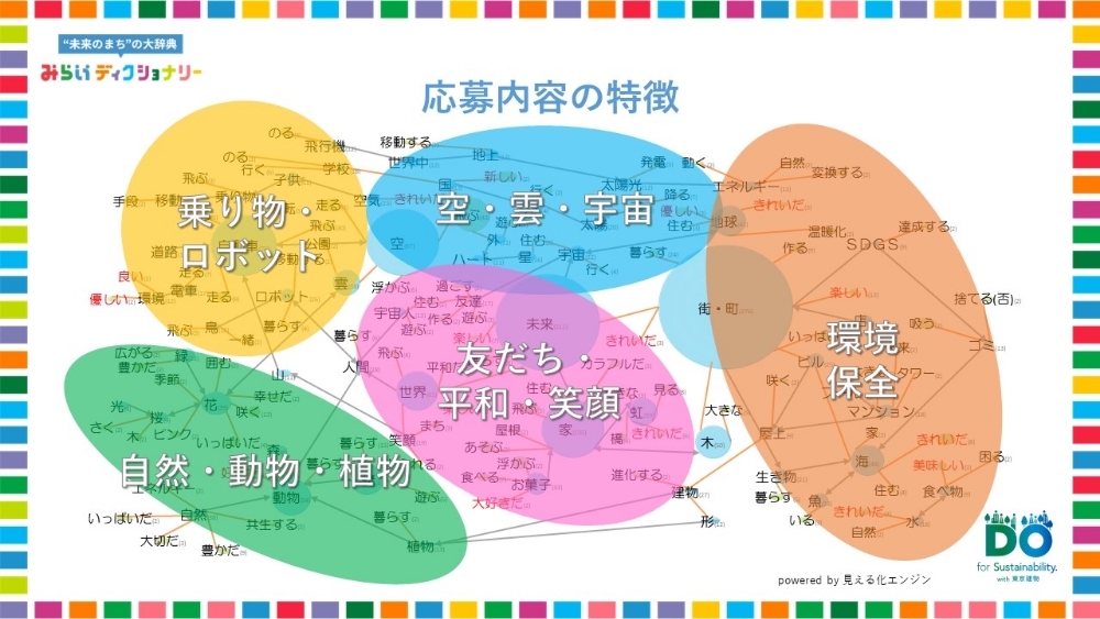 前述のように応募総数は947点(うち1点はAIさんの作品)で、17歳以下を中心に幅広い年齢層から、未来に向けた想いとアイデアが寄せられました。応募内容の特徴も、ごみ削減、自然エネルギーの利用といった「環境保全」はもとより、未来の居住地としての「空・雲・宇宙」、「友だち・平和・笑顔」、より良い暮らしをサポートする「乗り物・ロボット」、「自然、動物や植物などとの共生」など幅広く、自由な発想が広がる大辞典が完成しました。
