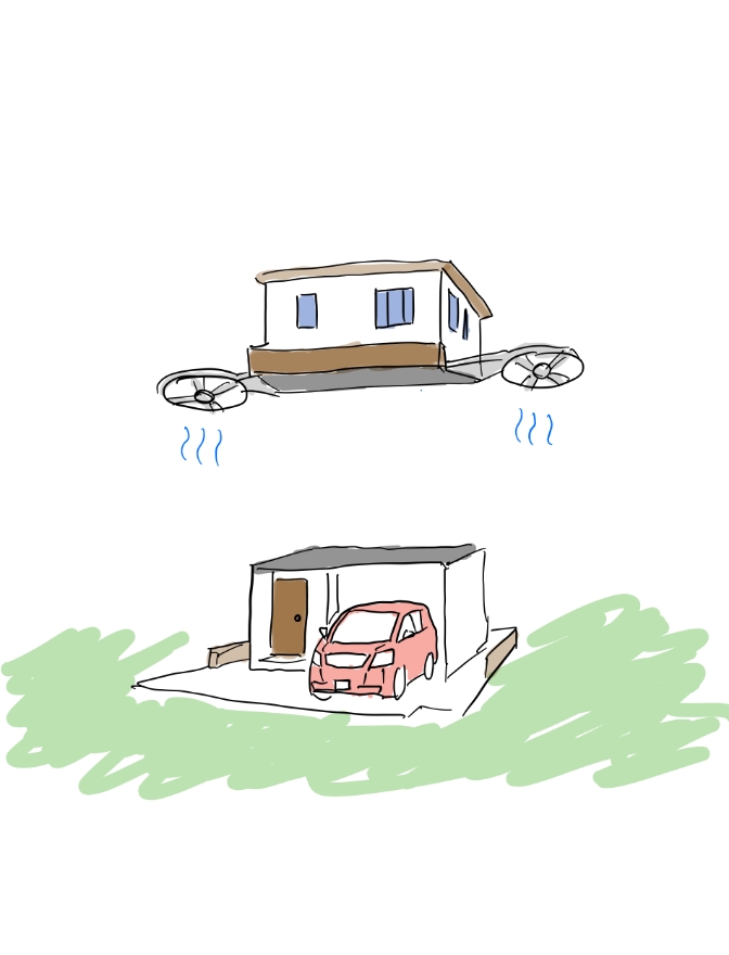 一軒家の2階部分が浮く。地震が来れば、2階に移動して浮くことで回避できる。また、浮く2階で旅に出ることもできる。