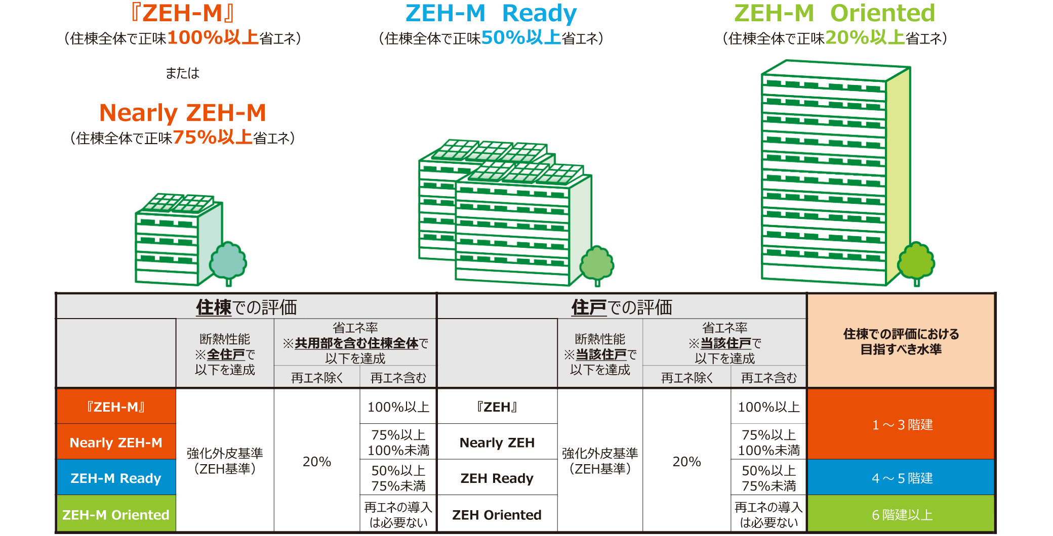 ZEH-Mには4つの基準があり、性能等によってそれぞれ定義されています。一般的に都市部などでマンションが高層化するほど、住戸数に対して太陽光パネルによる発電量の比率が低下してしまうため、マンションの規模毎に目指すべき水準も異なっています。