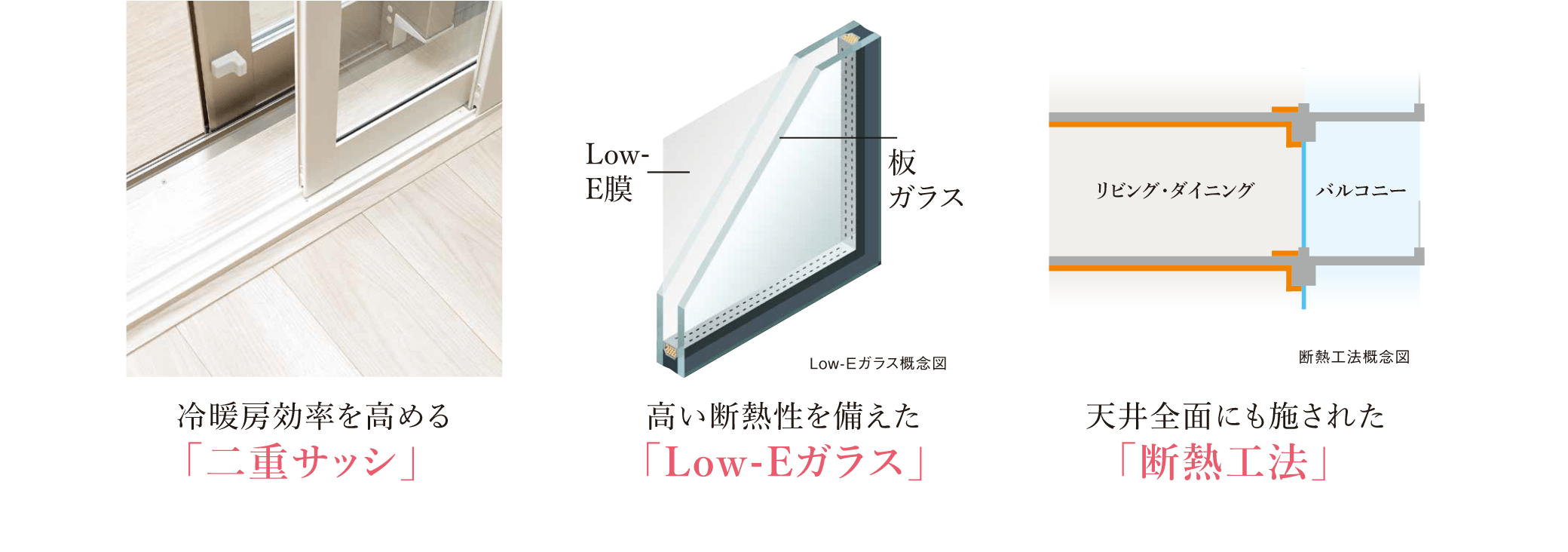 ZEH-Mを実現するために、「Brillia Tower 聖蹟桜ヶ丘 BLOOMING RESIDENCE」には様々な工夫が施されています。例えば、開口部には冷暖房効果を高める二重サッシや高い断熱性を備えたLow-Eガラスを設置、天井・壁には断熱工法を採用することで、できるだけ室内温度を一定に保つようにしています。断熱性能が高いため、光熱費の削減につながることはもちろん、夏は涼しく冬は暖かい快適な住環境が実現できるほか、ヒートショックなどのリスク回避にも有効です。