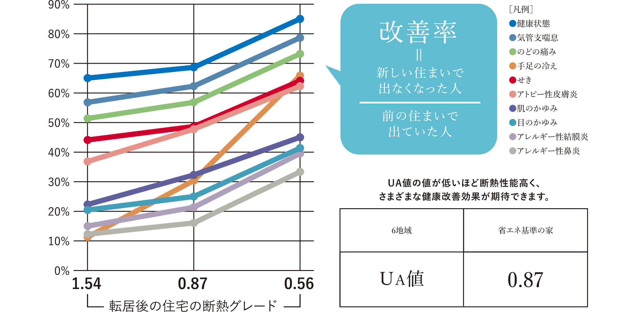 また、高断熱・高気密にともなう様々な健康効果(気管支喘息・アレルギー性鼻炎などの改善)も期待できます。省エネで地球に優しいだけでなく、住む人々の快適性や健康面についてもメリットがあるのがZEH-Mなのです。