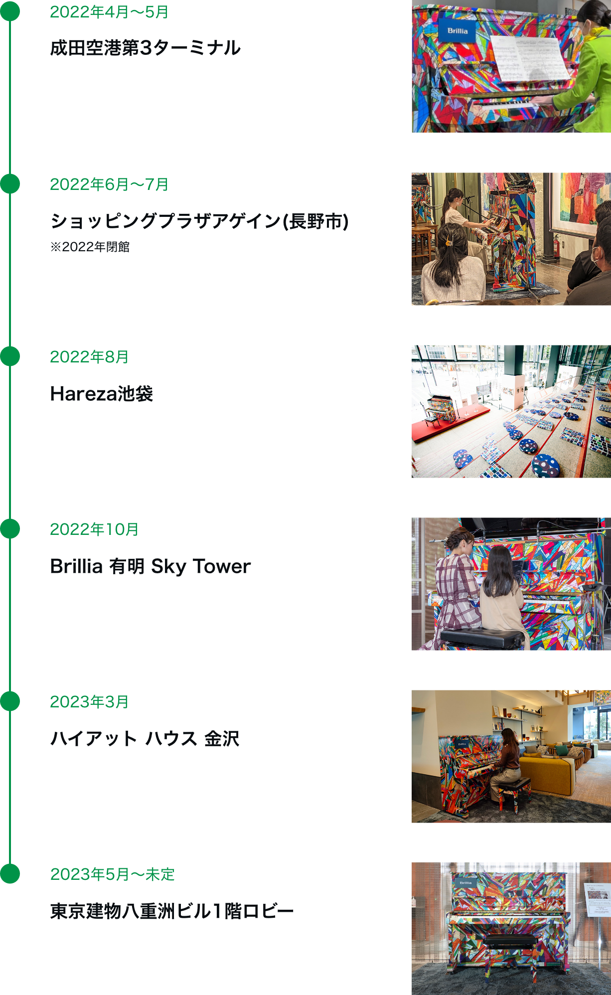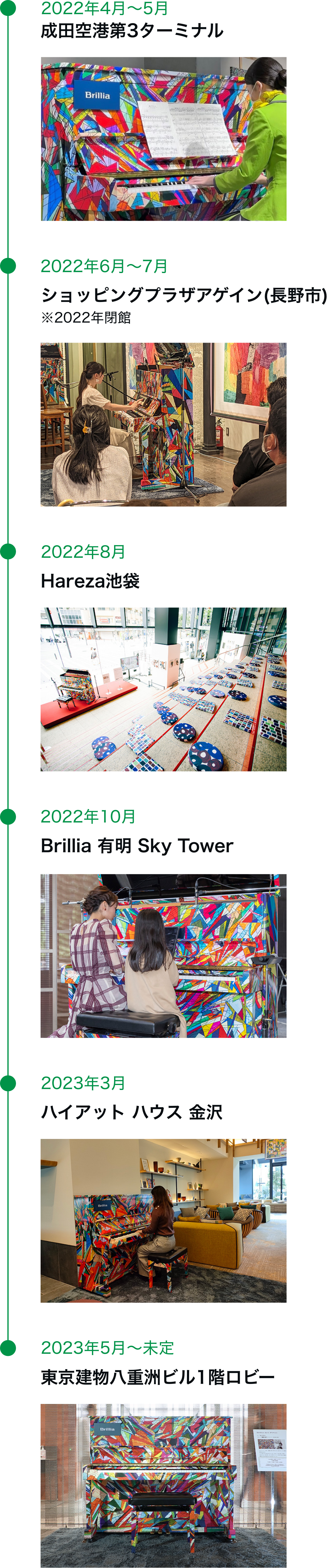 これまで全国各地でストリートピアノとして設置されたほか、東京建物が手掛けたマンションやオフィスビルのイベントでも披露され、多くの人々の目と耳を楽しませてきました。2023年7月現在は、東京建物八重洲ビル1階ロビーに設置されています。(場所:東京都中央区八重洲1-4-16 ※当ビル設置期間は入居テナント勤務者に限り演奏可能)