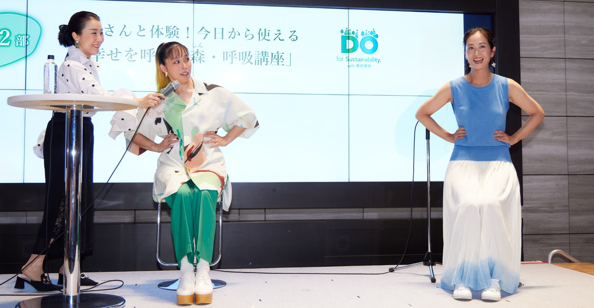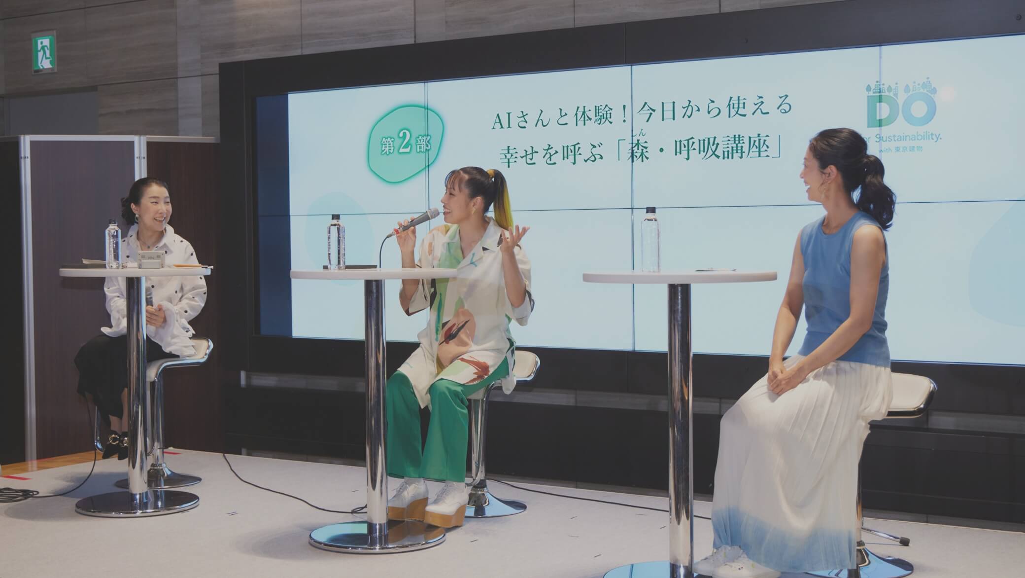 2023年8月に開業10年を迎えた大手町タワー・大手町の森で行われた「大手町の森10th Anniversary トークセッション~「都市の森」と「 森 ・呼吸」を考える~」の第2部では、第1部と雰囲気を変えて、東京建物サステナビリティパートナーであるAIさんと、呼吸アドバイザーの椎名由紀さんをお迎えし、森や呼吸をテーマとしたトークと手軽にリフレッシュできる呼吸法のレクチャー・体験をしていただきました。
