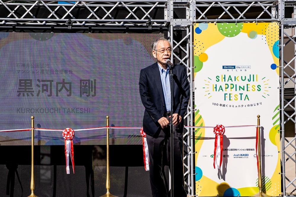 本イベントは、雲一つない晴天に恵まれました。冒頭のオープニングセレモニーでは、石神井公園団地マンション建替組合 理事長の黒河内剛氏が代表挨拶を行いました。その後、関係者5名によるテープカットを行い、まちびらきを祝いました。