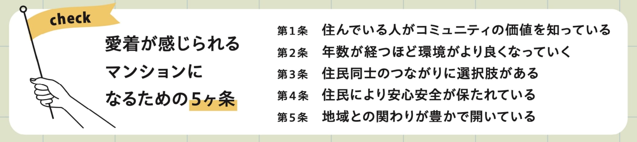 また、「愛着が感じられるマンションになるための5ヶ条」というものをご提案しています。