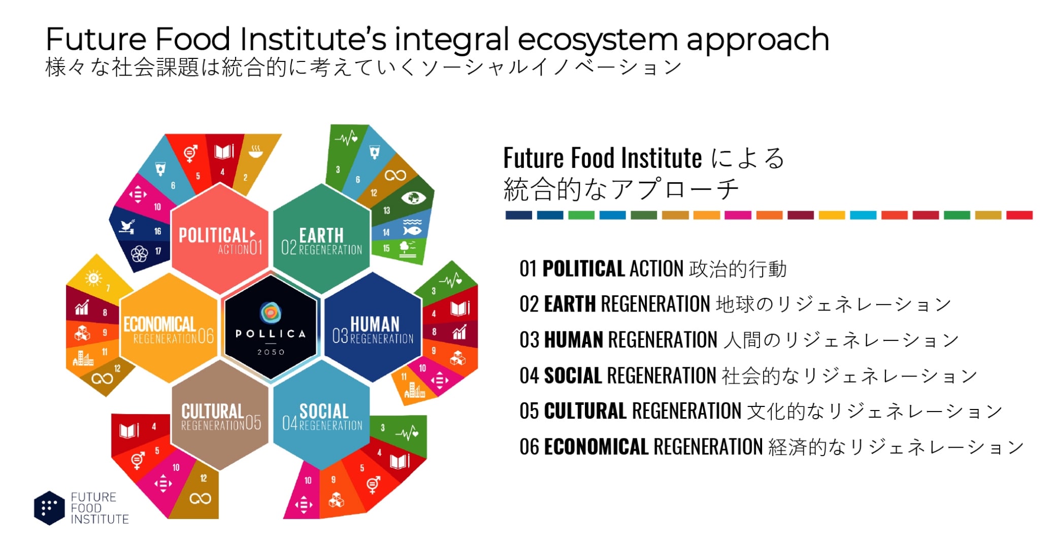 そのためにFuture Food Instituteは「教育・コミュニティ・イノベーション」という3つの活動領域を通じて、「政治」「地球」「人間」「社会」「文化」「経済」を包括する統合的なアプローチを続けています。