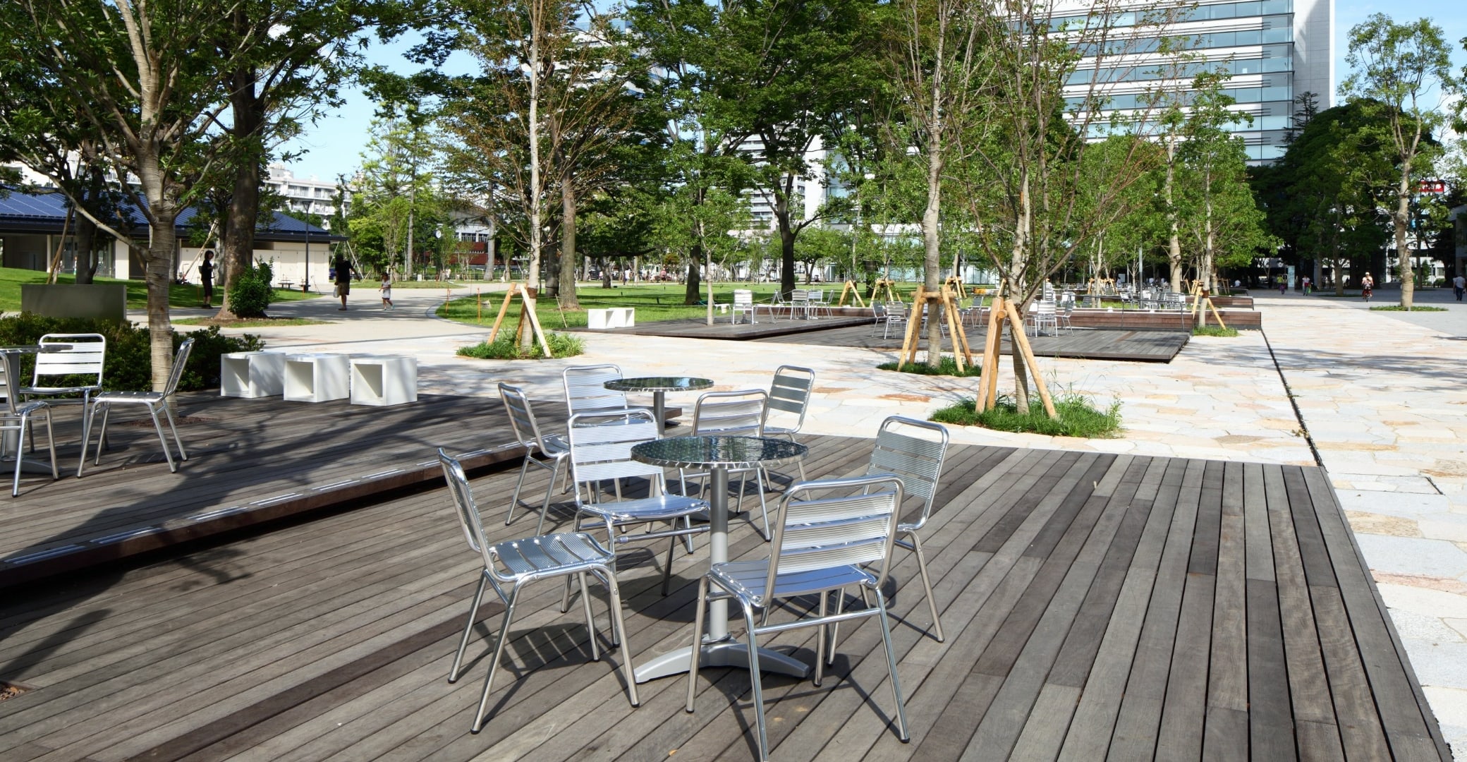 パークアベニューに沿って配置されたウッドデッキでは無料でWi-Fi(無線LAN)を提供。テーブルやベンチでパソコン作業をしたり、青空会議を開催したりと、自由なワークスタイルを提供します。