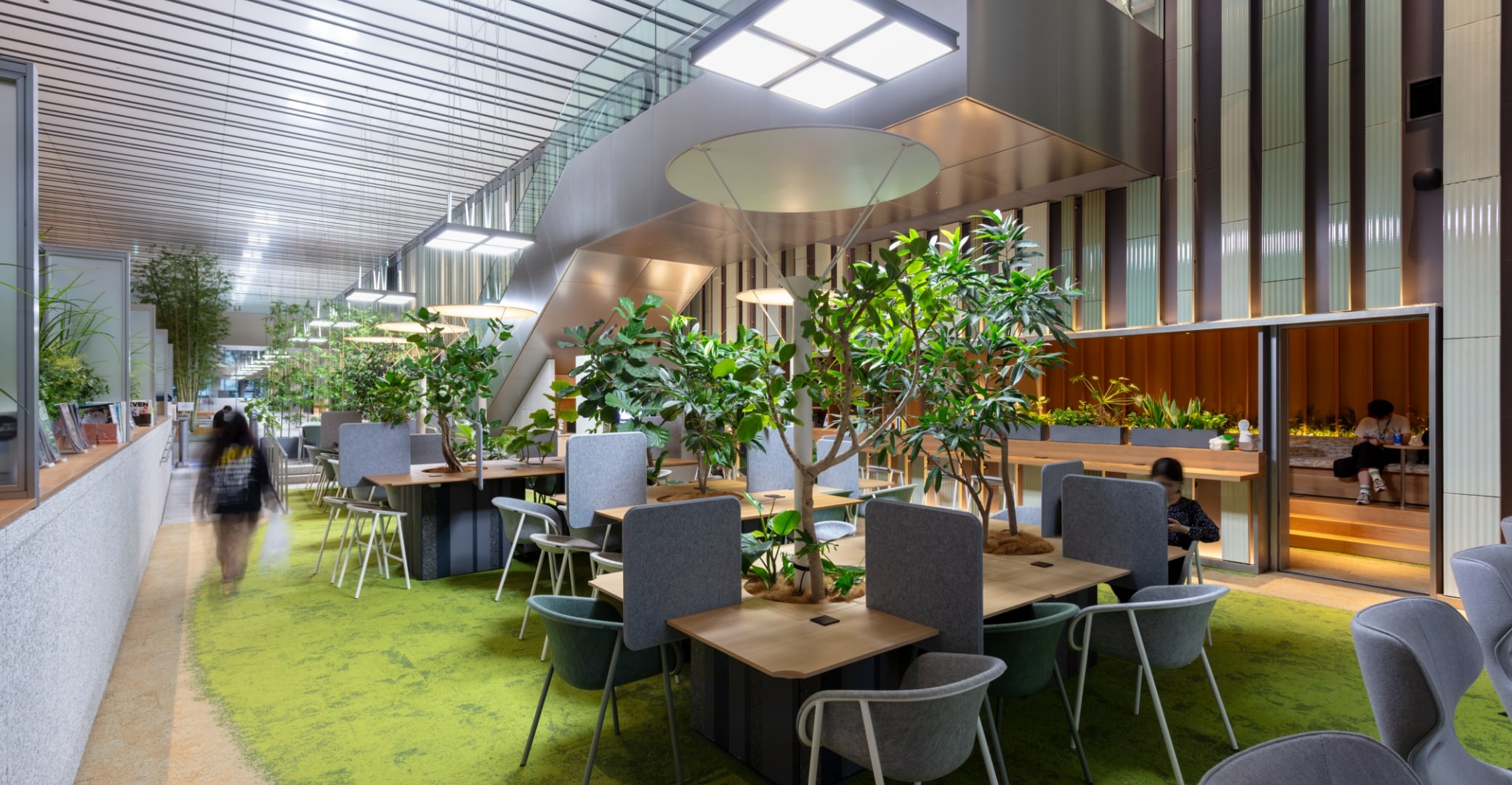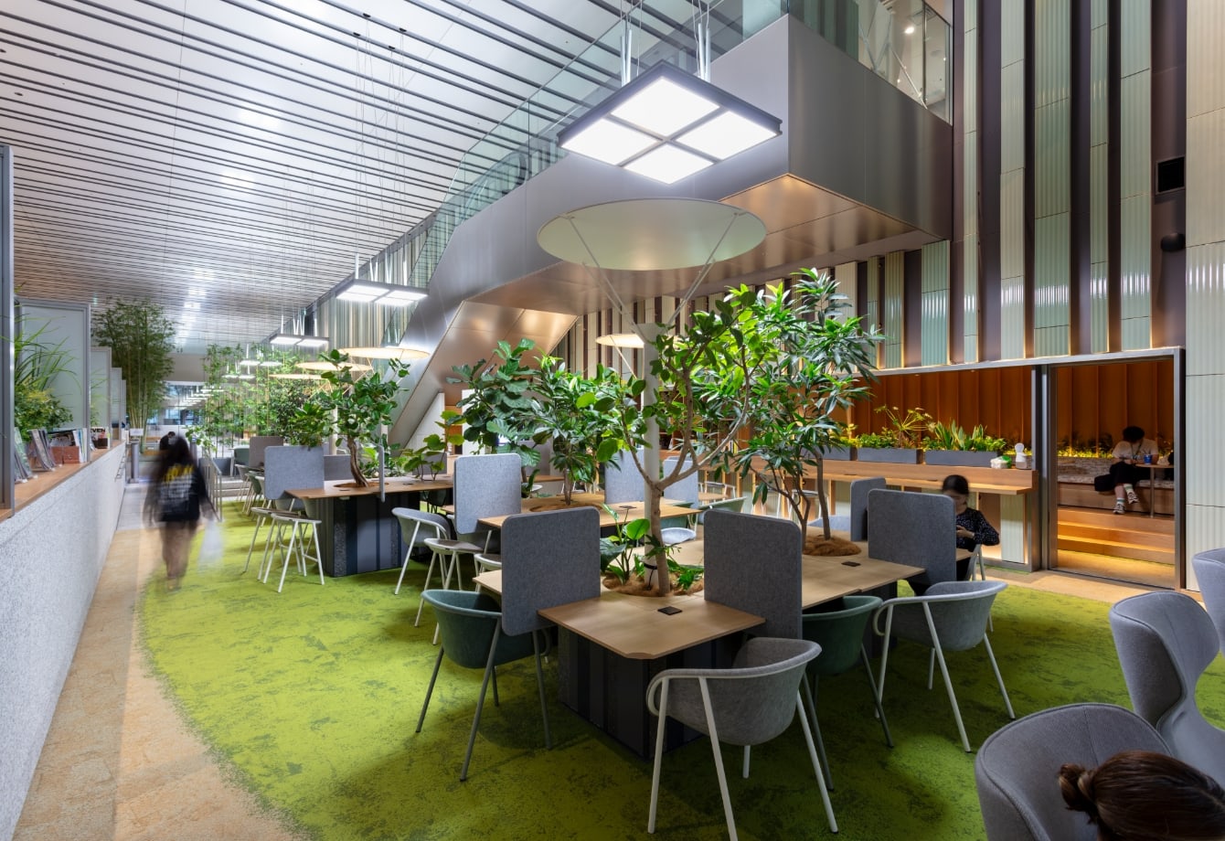 アンケート結果で特徴的だったのは、コミュニケーションの活性化やサービスの提供よりも「ひとりになりたい」という声が多かったこと。そこでコンセプトを「茂みワークス」とし、ひとりがけのテーブルと視線を遮るグリーンを多く配置して、パーソナルスペースを多く確保しました。