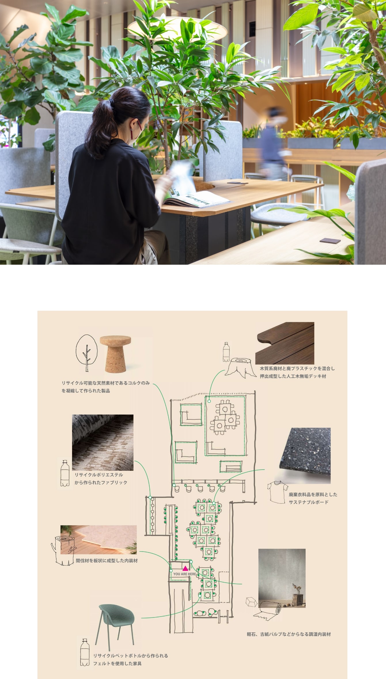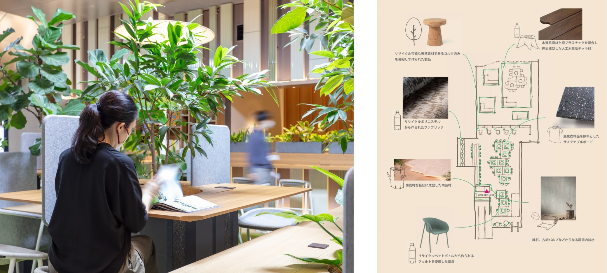 「ガーデンラウンジ」の内装には、環境に配慮したアップサイクル製品を中心に採用しました。例えば間伐材を成型した内装材、リサイクルポリエステルのファブリック、ペットボトルから作られるフェルトを使ったチェアなど。愛用しながらサステナビリティへの理解も深めていただけます。