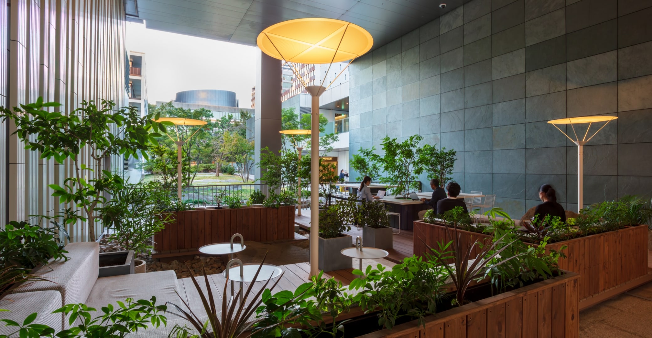 中野セントラルパークでは、日々ご入居いただいているみなさまの意見を聞き、ニーズに基づいて改善を行っています。サウス棟1階の入居オフィスワーカー専用スペース「ガーデンラウンジ」。このラウンジを2022年に全面リニューアルした際も、設計前に500名以上のオフィスワーカーの方々にアンケートを募り、集まった声をレイアウトなどに反映しました。