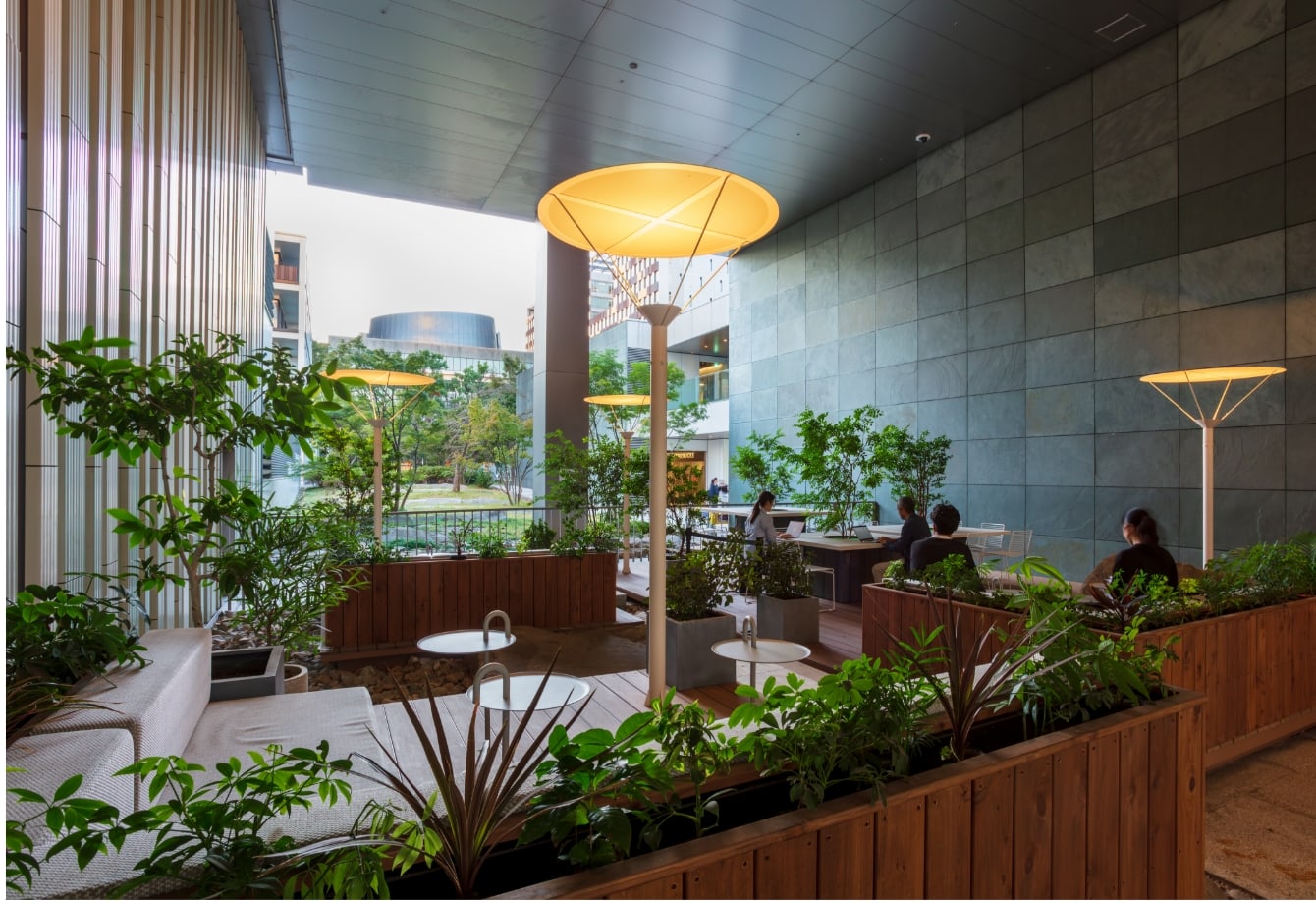 さらに、ゆったりしたソファを配置した屋外スペースも新たに整備。こちらは「オープン&グリーン」をコンセプトに、リゾートのような開放感のあるインテリアが上質な時間を提供します。屋内・屋外ともに電源とWi-Fiを完備しており、ワークスペースの選択肢のひとつとして活用できます。