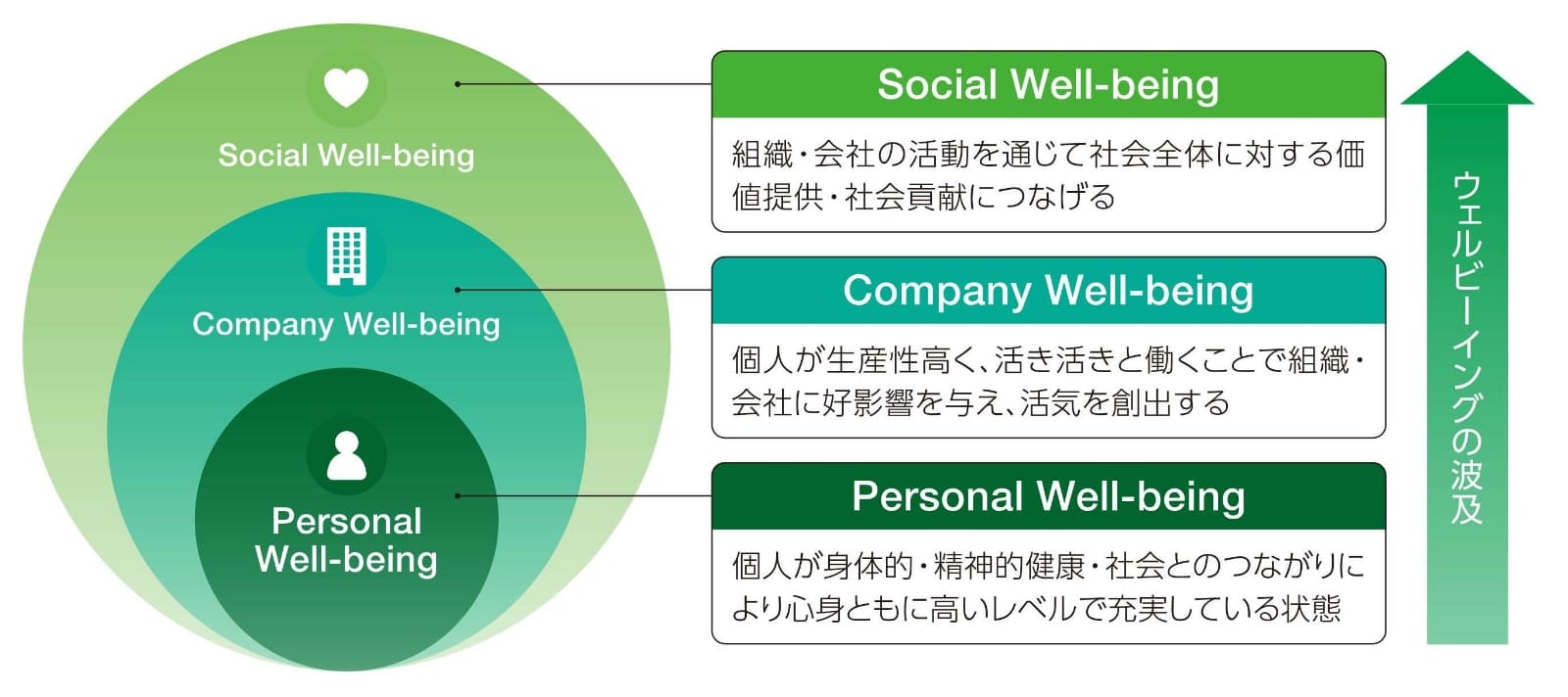 ウェルビーイングとは、「Well(よい)」と「Being(状態)」が組み合わさった言葉で、心身ともにいきいきと心地よくあり続けられる状態を表し、国では「ウェルビーイング=生活満足度」と置き換えられることもあります。企業においては、従業員のウェルビーイングが着目され、格付け機関のS&Pグローバルが従業員ウェルビーイングを企業評価に組み込むなど、その重要性はますます高まっています。