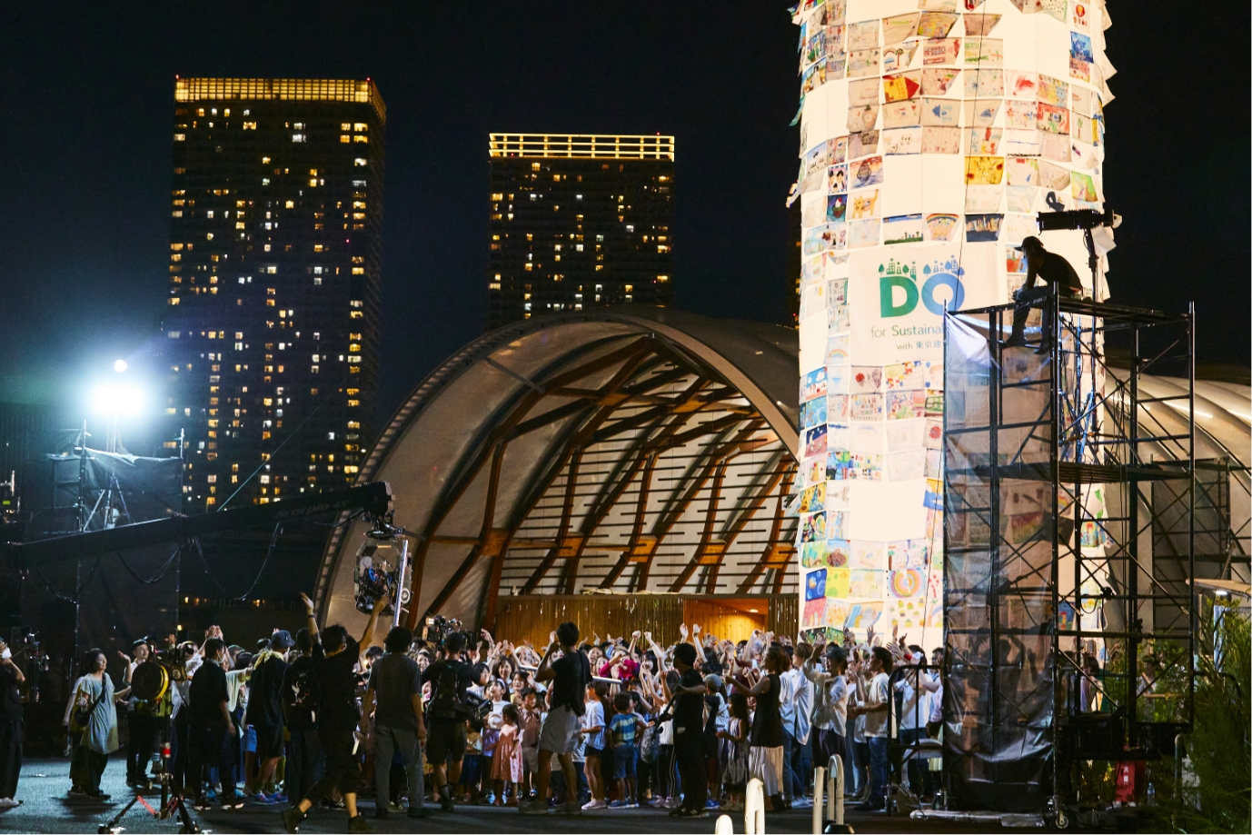 たくさんの人びとの未来への希望や想いが詰まった「未来のまち」の絵で彩られた巨大モニュメントが立ち上がっていく様子にもご注目ください。
