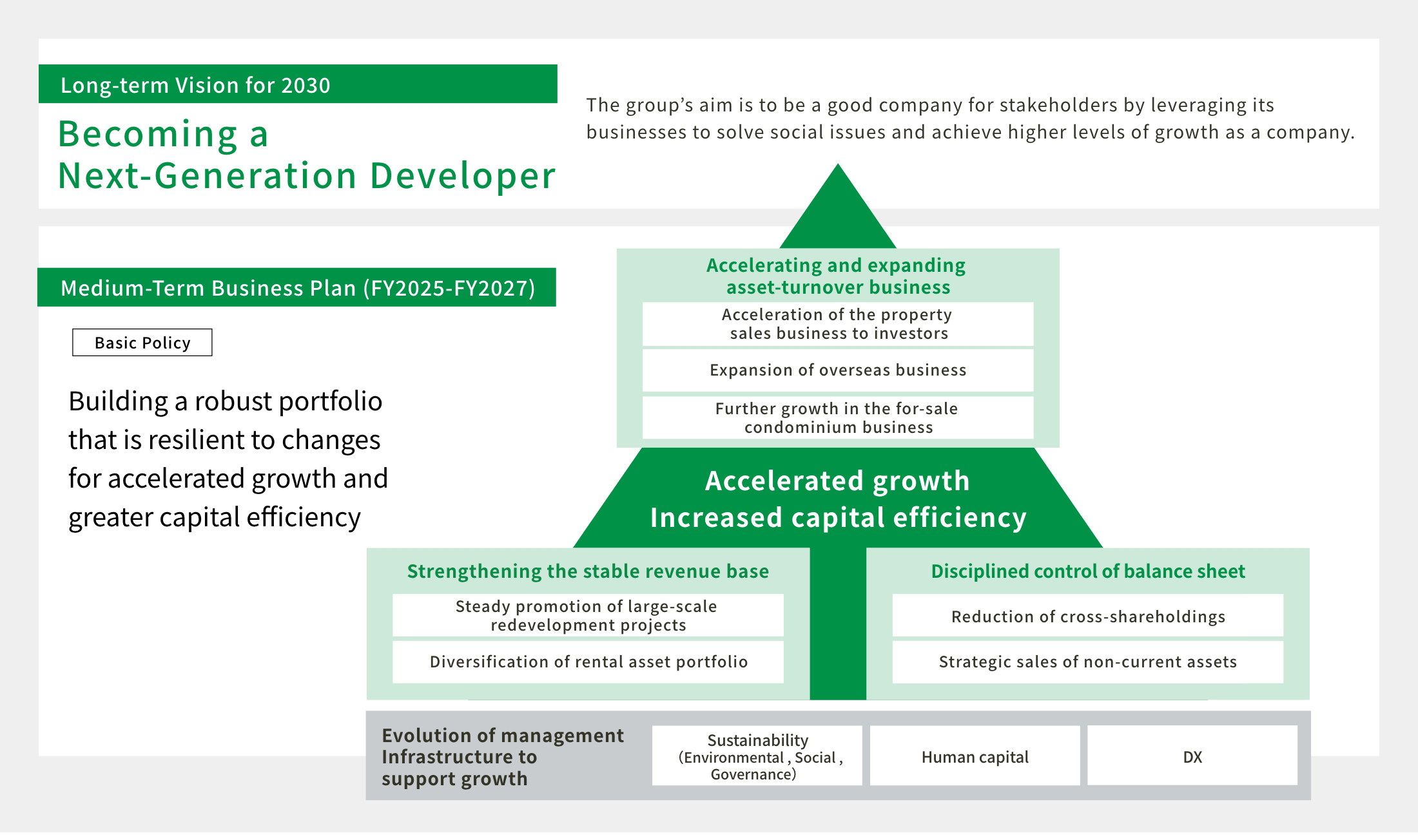The group's aim is to be a good company for stakeholders by leveraging its businesses to solve social issues and achieve higher levels of growth as a company.