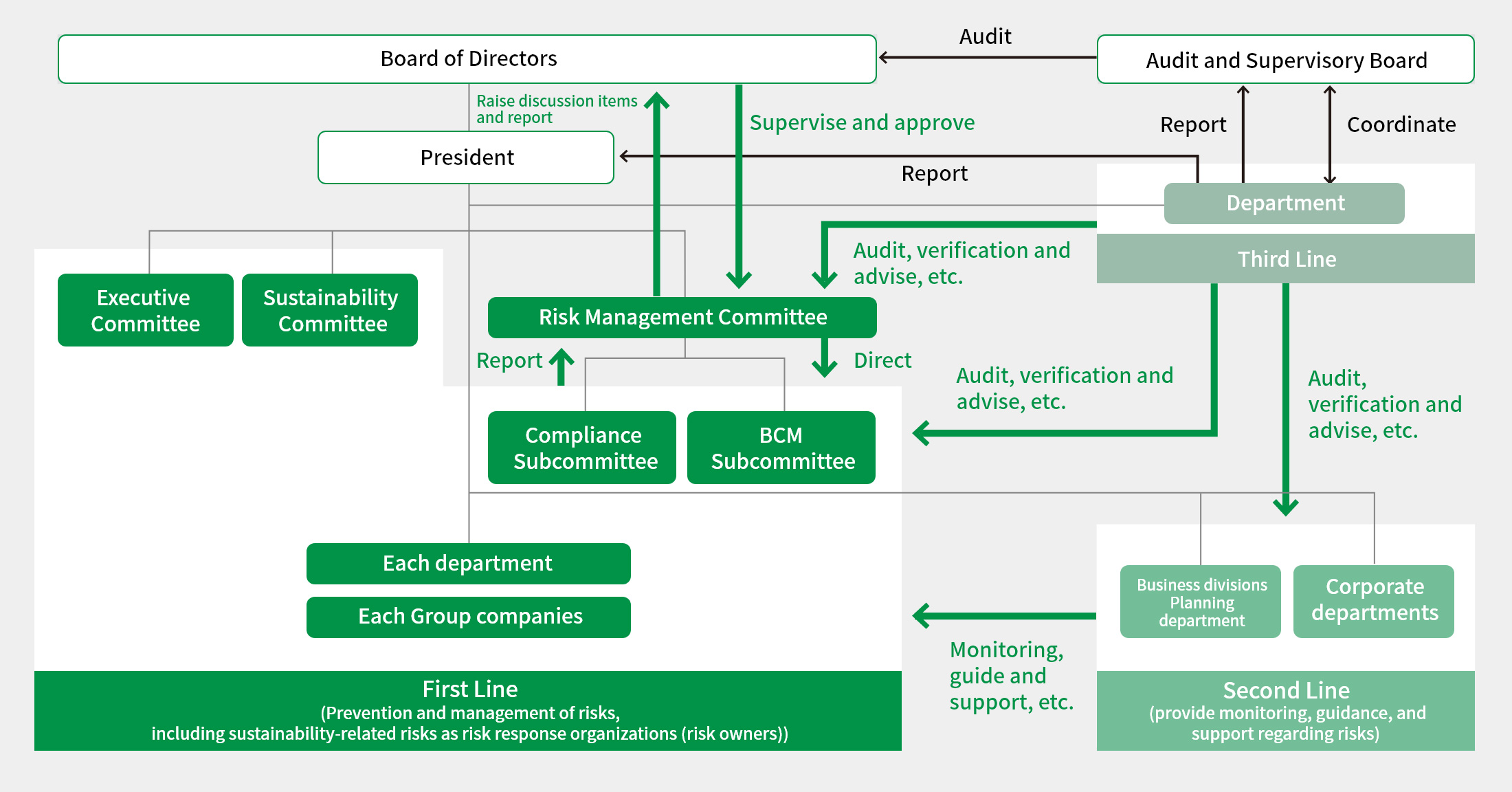 The Risk Management Committee formulates annual risk management plans, evaluates and analyzes risks that are important to the Group's management (priority risks to be addressed), formulates preventive measures and countermeasures, and periodically monitors the status of countermeasures while regularly presenting agenda items for deliberation and submitting reports to the Board of Directors.