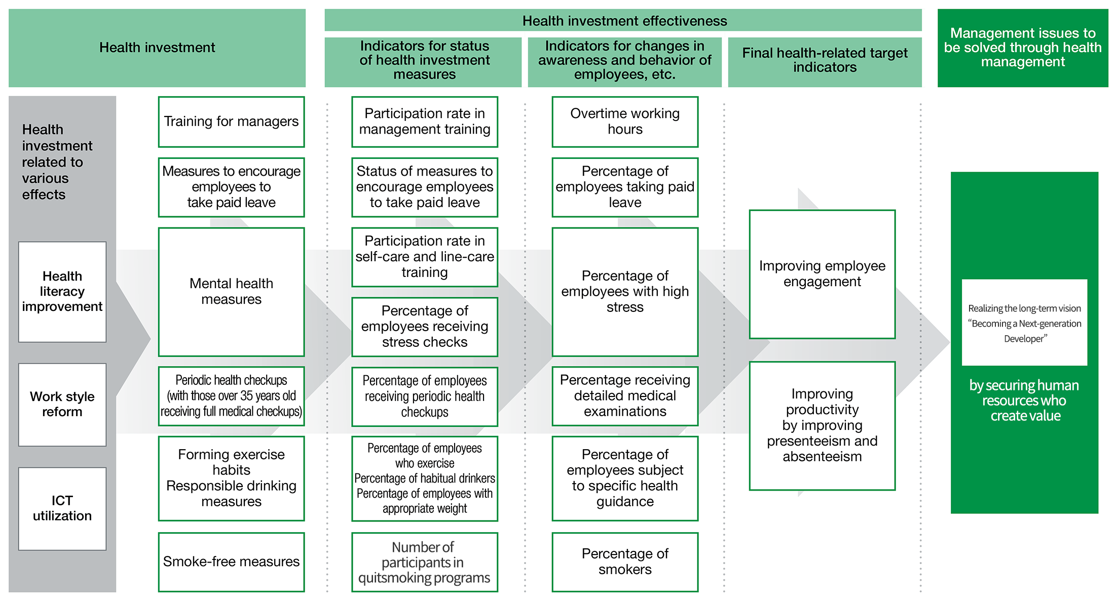 To enable our officers and employees to be healthy in body and mind and to work with a lively spirit, the Tokyo Tatemono Group has designated the President as the Chief Health Officer (CHO) and we are working on initiatives to maintain and improve the health of each individual Group officer and employee in accordance with the Group Health Management Declaration. With regard to health management, we have identified improving employee growth and job satisfaction as one of our material issues. We have set KPIs and targets based on this material issue, promoting efforts to achieve these targets.