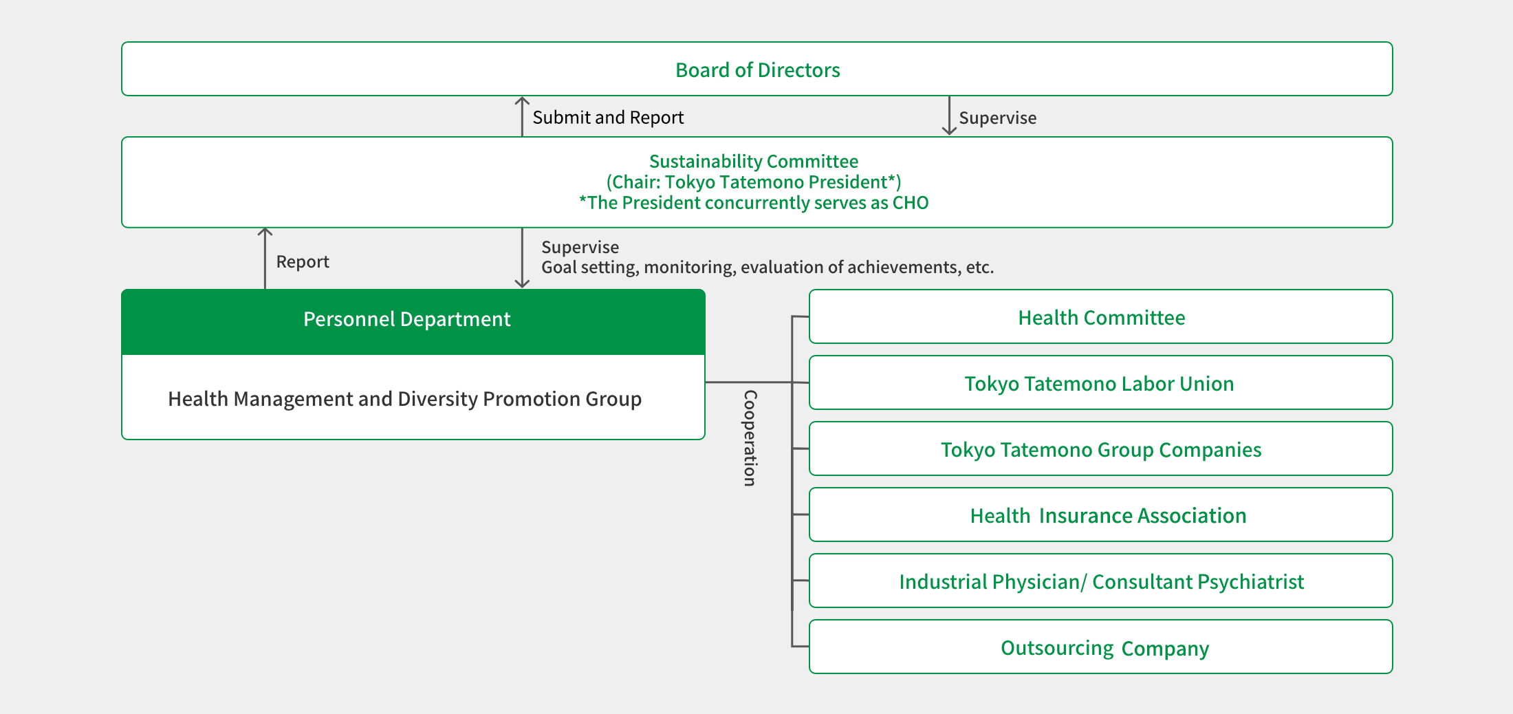 The Tokyo Tatemono Group's Sustainability Committee, chaired by the President, sets goals for the promotion of health management based on the material issue of improving employee growth and job satisfaction, defines specific initiatives to achieve these goals, monitors progress, and evaluates the details of achievement. Important matters deliberated and discussed by the Committee are submitted to or reported to the Board of Directors for supervision.