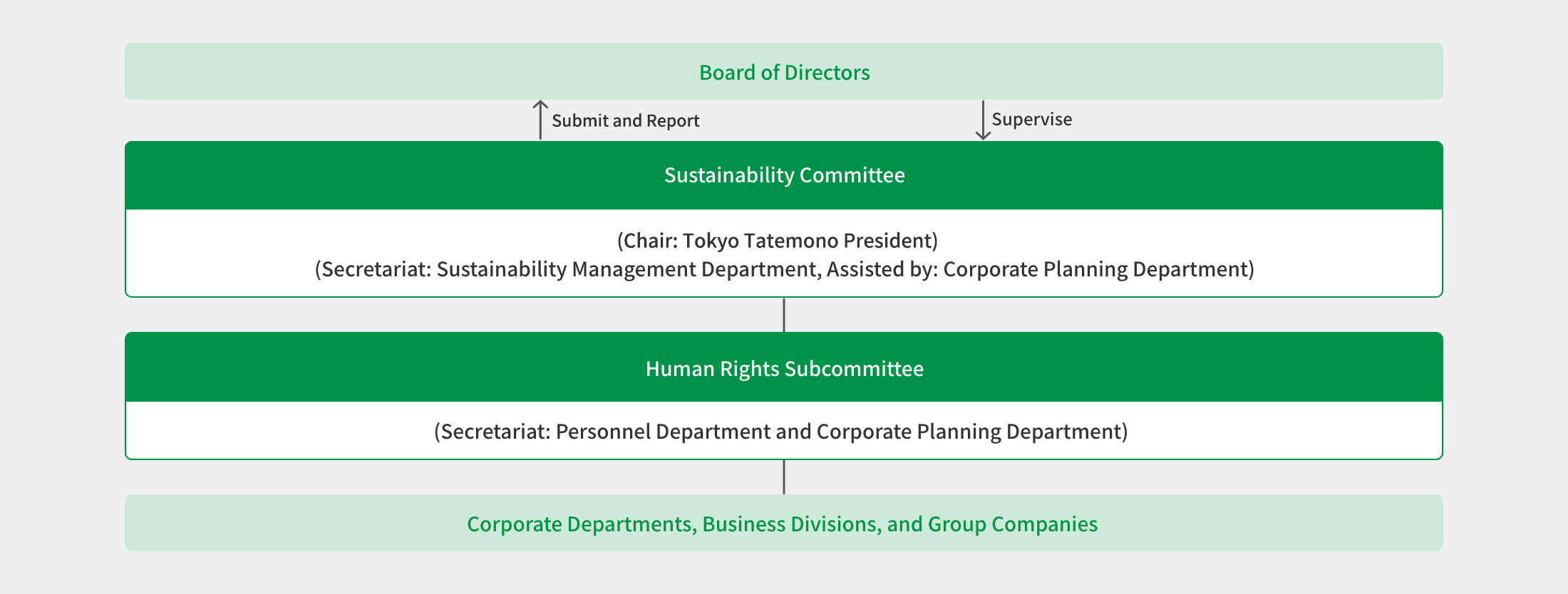 The Tokyo Tatemono Group, led by the Sustainability Committee, chaired by the President, and the Human Rights Subcommittee, which is a subordinate organization of the Sustainability Committee, promotes human rights initiatives together with relevant departments and Group companies, and with support from external experts.