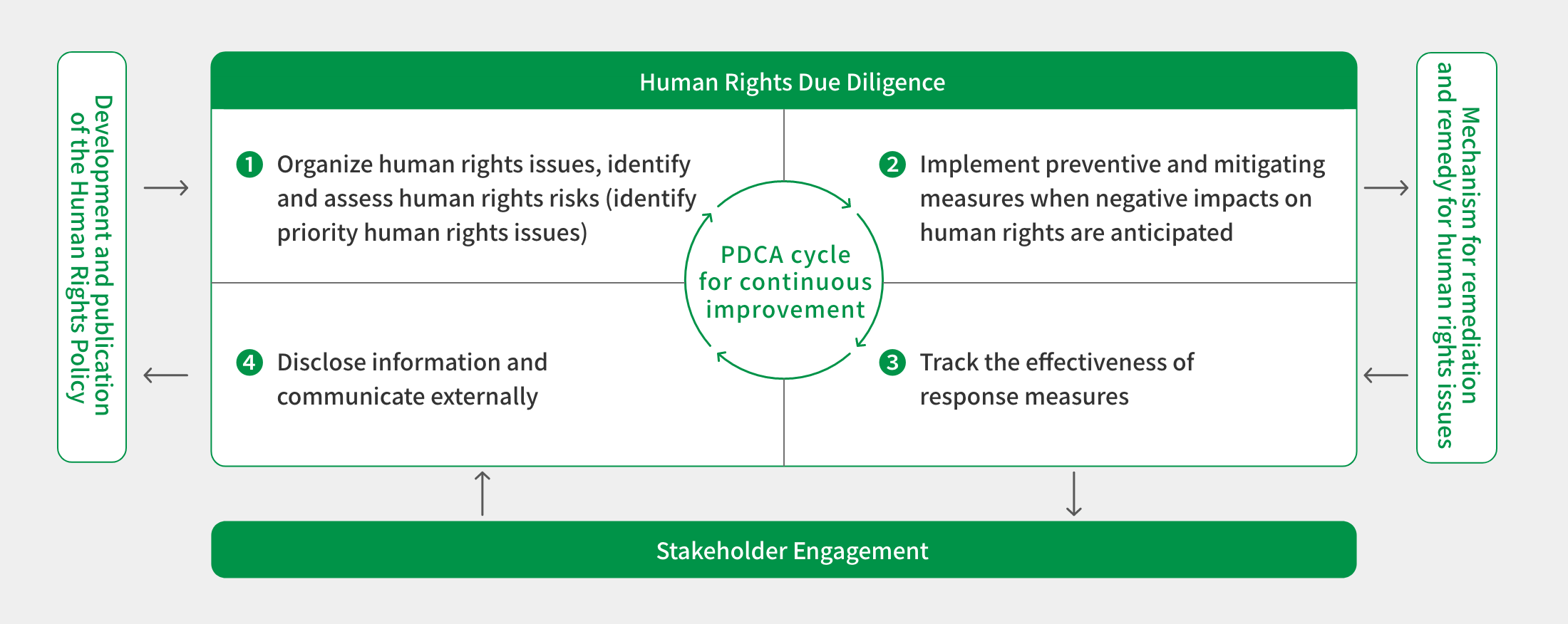 Through human rights due diligence based on this policy, the Tokyo Tatemono Group is working to identify issues related to human rights in the Tokyo Tatemono Group's business, mitigate or correct any issues that exist, and provide relief to those who have been adversely affected by any human rights issues.