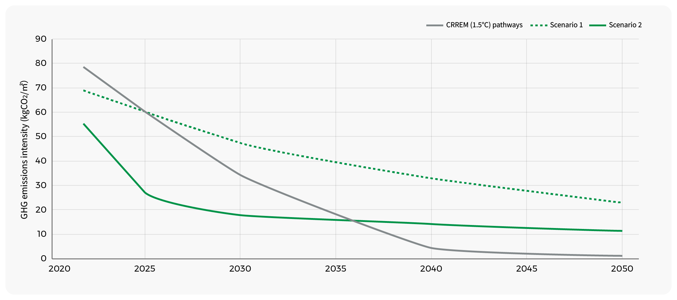 In accordance with CRREM's analysis methodology, we compared the GHG emissions pathways of our portfolio with the CRREM pathways consistent with the 1.5℃ targets for the following two scenarios.
