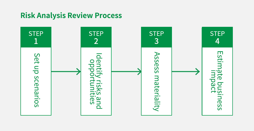 Tokyo Tatemono uses scenario analysis to identify climate change risks and opportunities and to evaluate their importance and impact on the Group's financial interests.