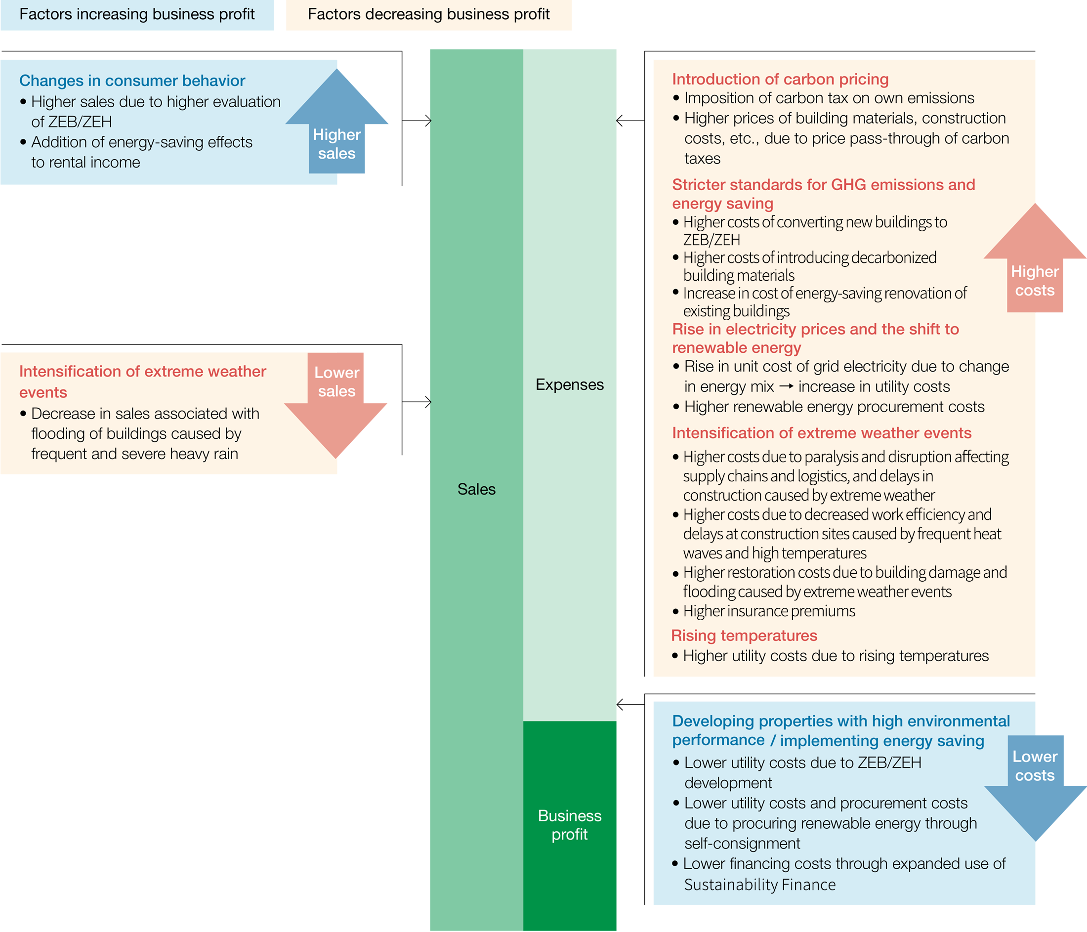 Focusing on the Group's core businesses, the Commercial Properties Business and Residential Business, we identified the main climate change risks and opportunities and assessed their materiality in terms of their expected degree of impact on the Group's finances and likelihood of occurrence. The period of impact was categorized into short-term (1-5 years), medium-term (5-10 years), and long-term (>10 years).