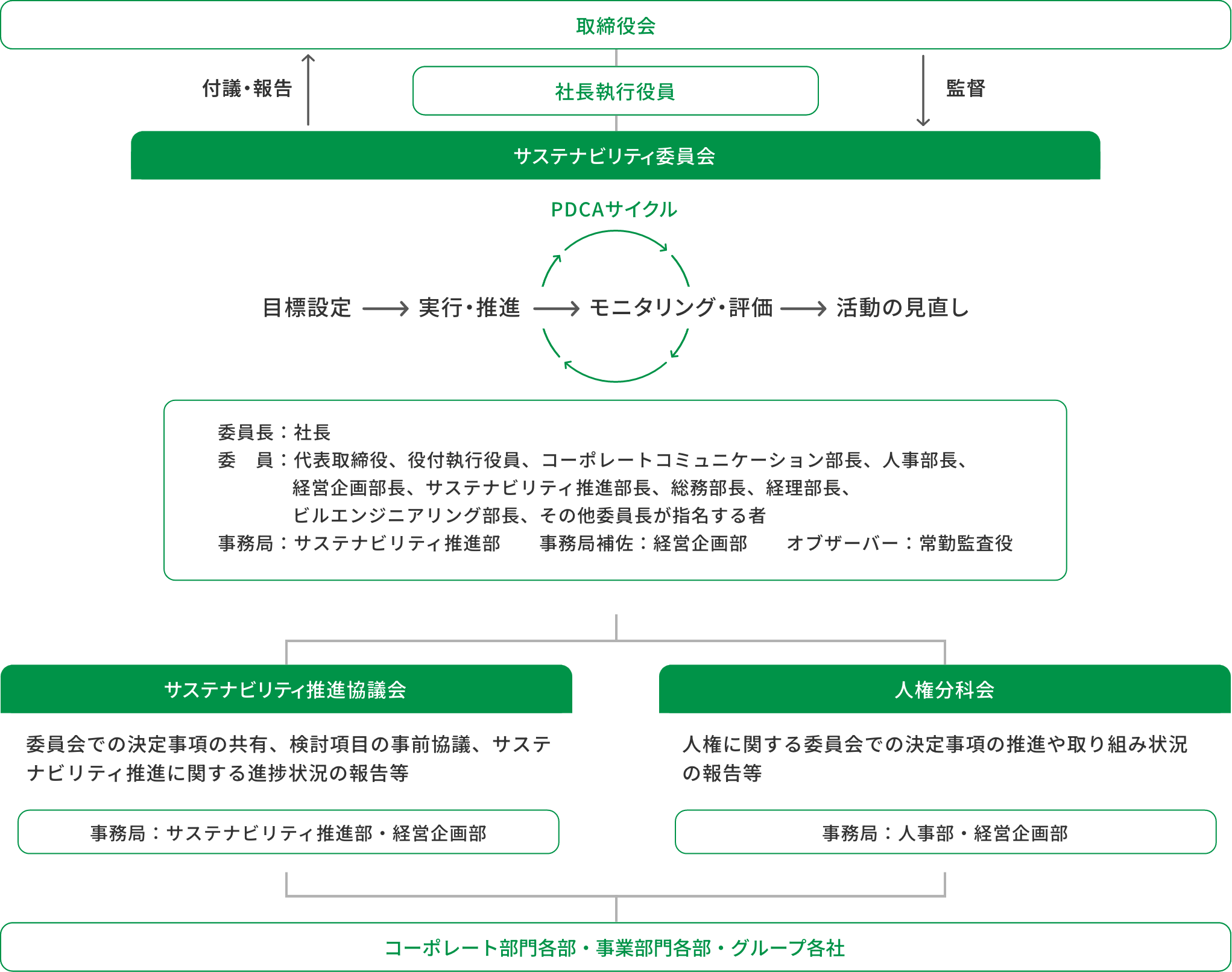 当社は、サステナビリティの取り組みを当社グループ全体で横断的かつ継続的に推進するため、当社社長を委員長とするサステナビリティ委員会を設置するとともに、下部組織としてサステナビリティ推進協議会および人権分科会を設置しています。
