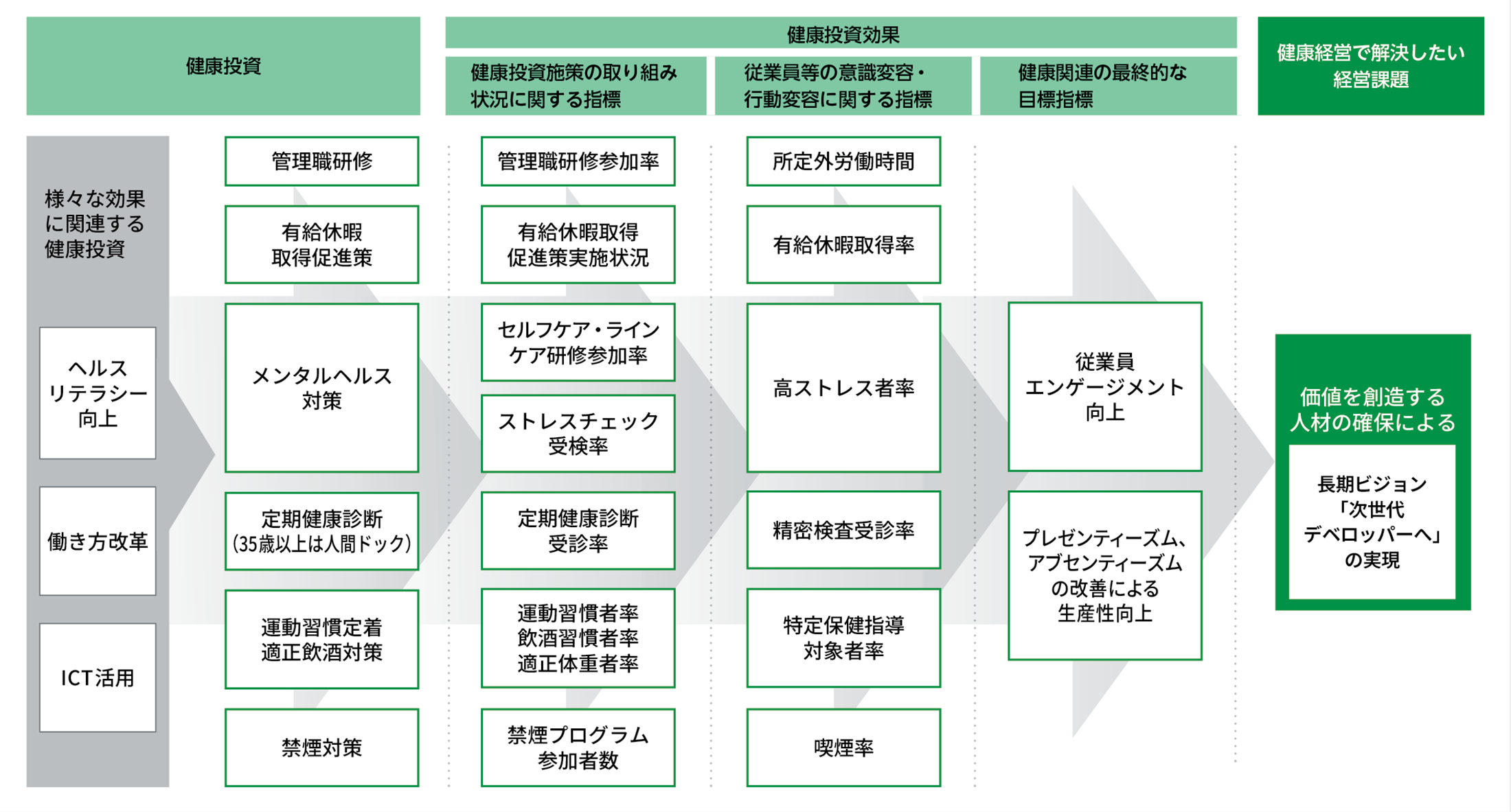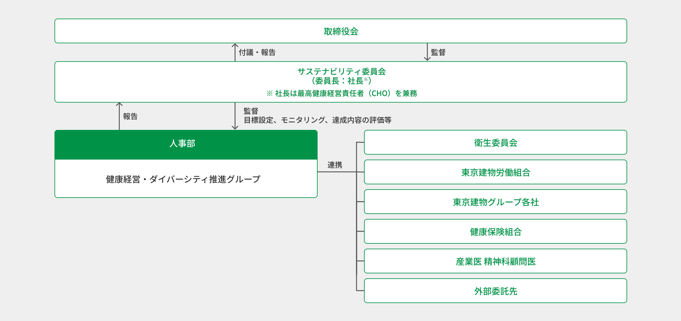 当社グループは、当社社長を委員長とするサステナビリティ委員会において、マテリアリティとして特定した「従業員の成長と働きがいの向上」に基づき「健康経営の推進」に関する目標を設定し、その達成に向けた具体的な取り組みを定め、進捗状況等のモニタリング、達成内容の評価を行っています。委員会での審議および協議事項のうち重要事項は取締役会に付議または報告され、取締役会が監督しています。