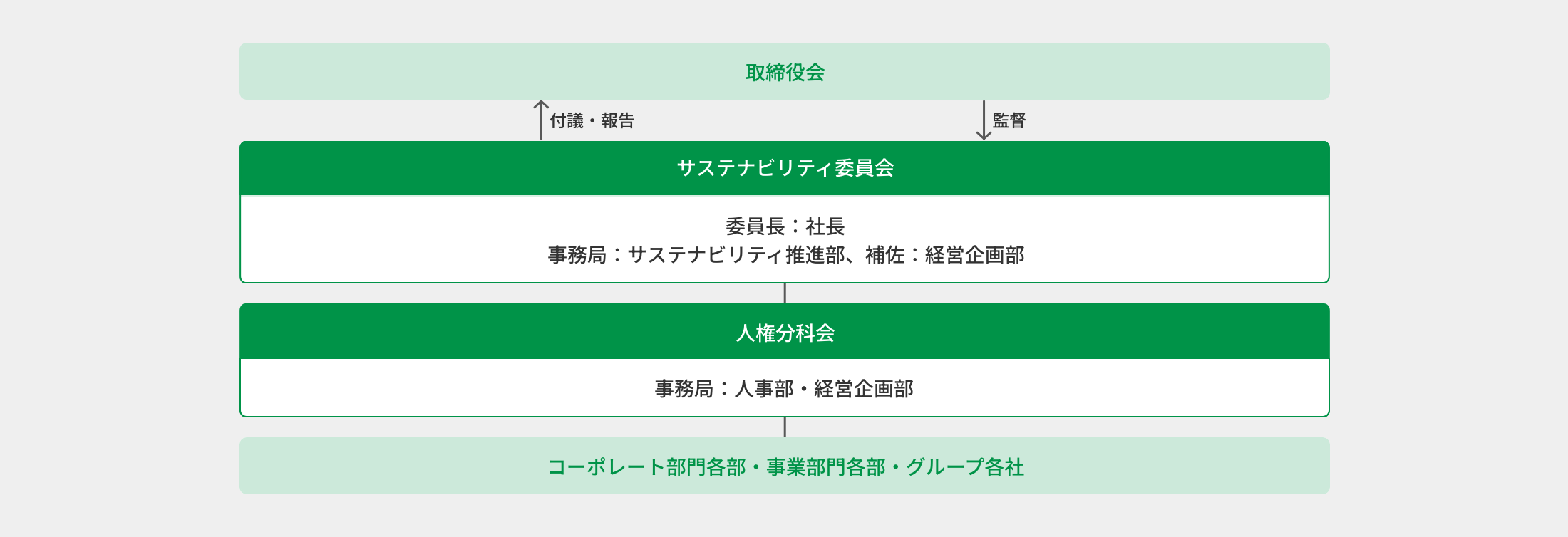 当社グループは、当社社長を委員長とするサステナビリティ委員会を中心に、サプライチェーンマネジメントに関する取り組みを進めています。サステナビリティ委員会では、サステナブル調達基準の策定や見直し、重要なサプライヤーの特定をはじめ、サプライチェーンマネジメントに関する重要な方針の審議や協議、それに基づく取り組み状況のモニタリングや評価を行っています。委員会での審議や協議事項のうち重要事項については、取締役会へ付議または報告することにより、サプライチェーンマネジメント全般に関して取締役会が監督しています。