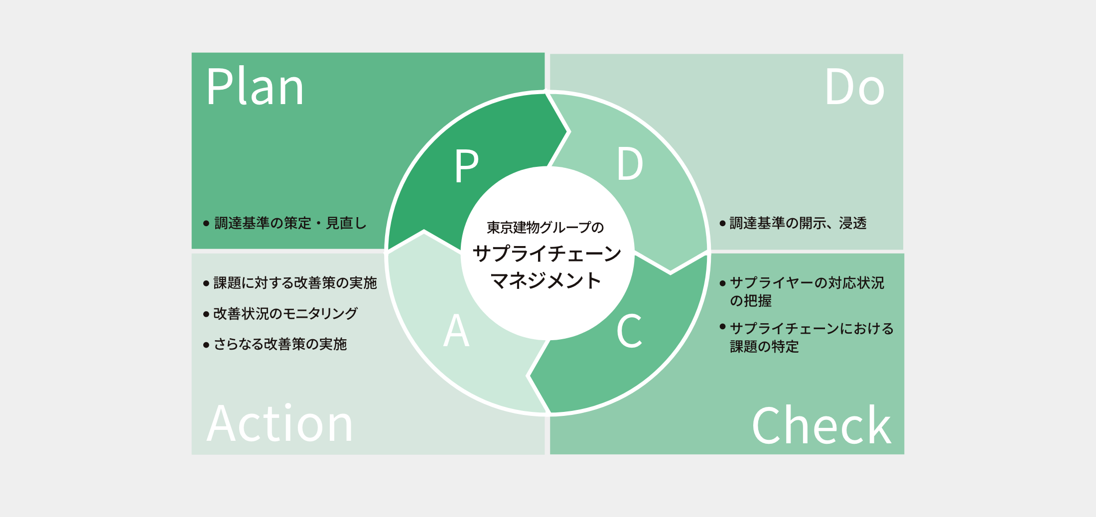 当社グループは、建設会社や建物管理会社をはじめ、多くのサプライヤー(事業活動における調達にかかわる取引先)と協働して事業を進めています。現在、企業は自社においてはもちろん、サプライチェーン全体での人権の尊重や環境への配慮などを含むサステナブルな調達の実現が求められています。そのため、サプライヤーにおける環境や社会への影響を踏まえた、持続可能なサプライチェーンの構築が不可欠です。