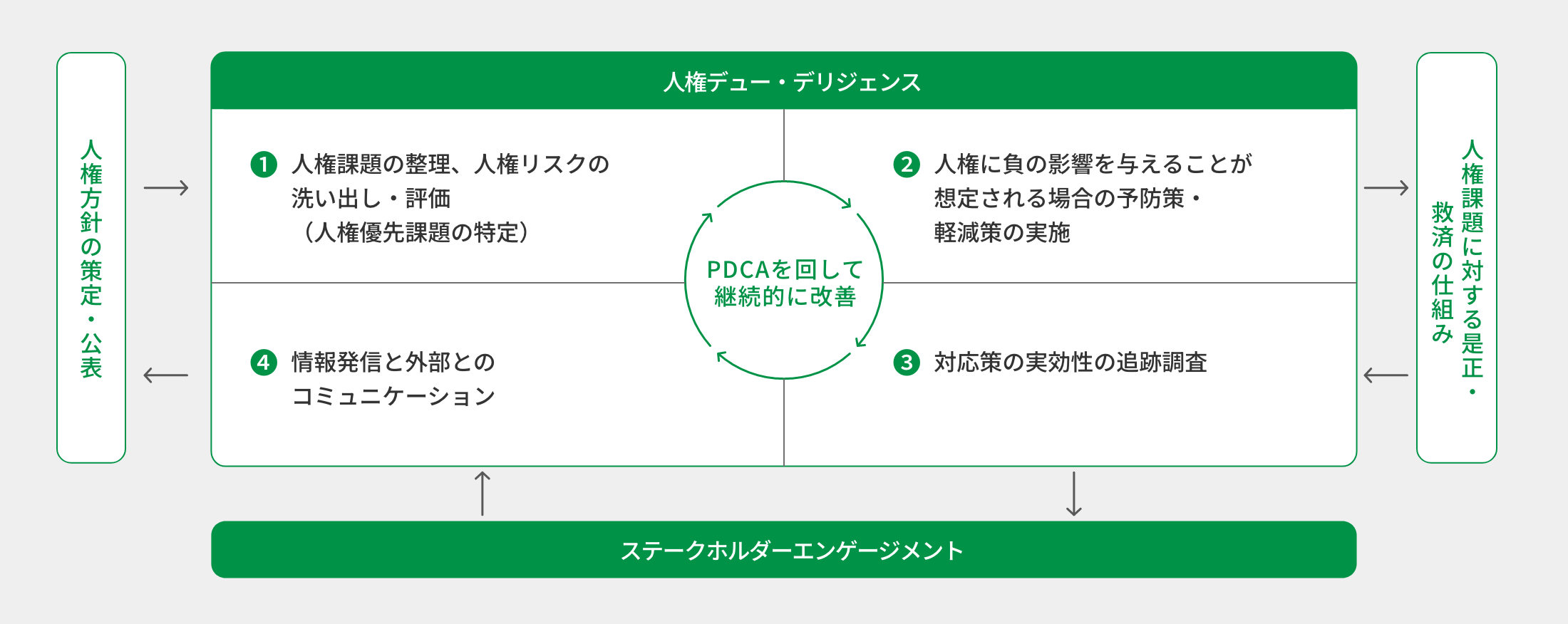 また、当社グループでは、本方針に基づく人権デュー・デリジェンスを通して、当社グループの事業における人権に関する課題の把握、課題がある場合の軽減や是正、人権に関する負の影響を受けた人がいる場合の救済に取り組んでいます。