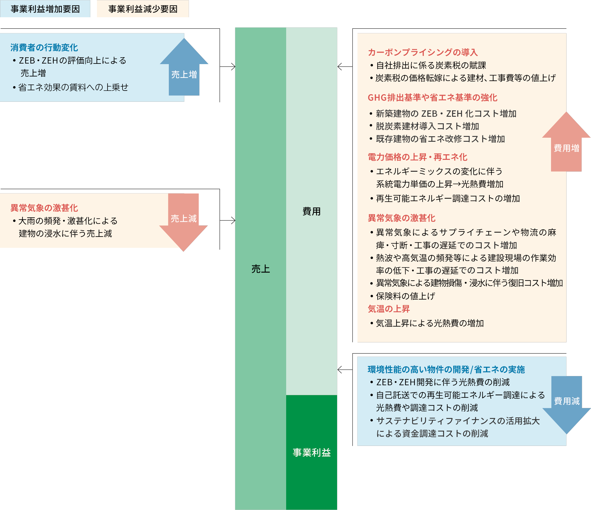 当社グループの財務に与える影響の大きさを考慮し、主力事業であるビル事業と住宅事業を対象として、建物を開発・保有するエリアや、開発、運営・管理、販売・売却の各事業フェーズの実態を踏まえ、それぞれで想定される気候変動に関するリスク・機会を特定したうえで、その影響度と発生可能性から重要度評価を行っています。なお、影響を受ける期間を、短期(1~5年)、中期(5~10年)、長期(10年超)に分けて整理しています。