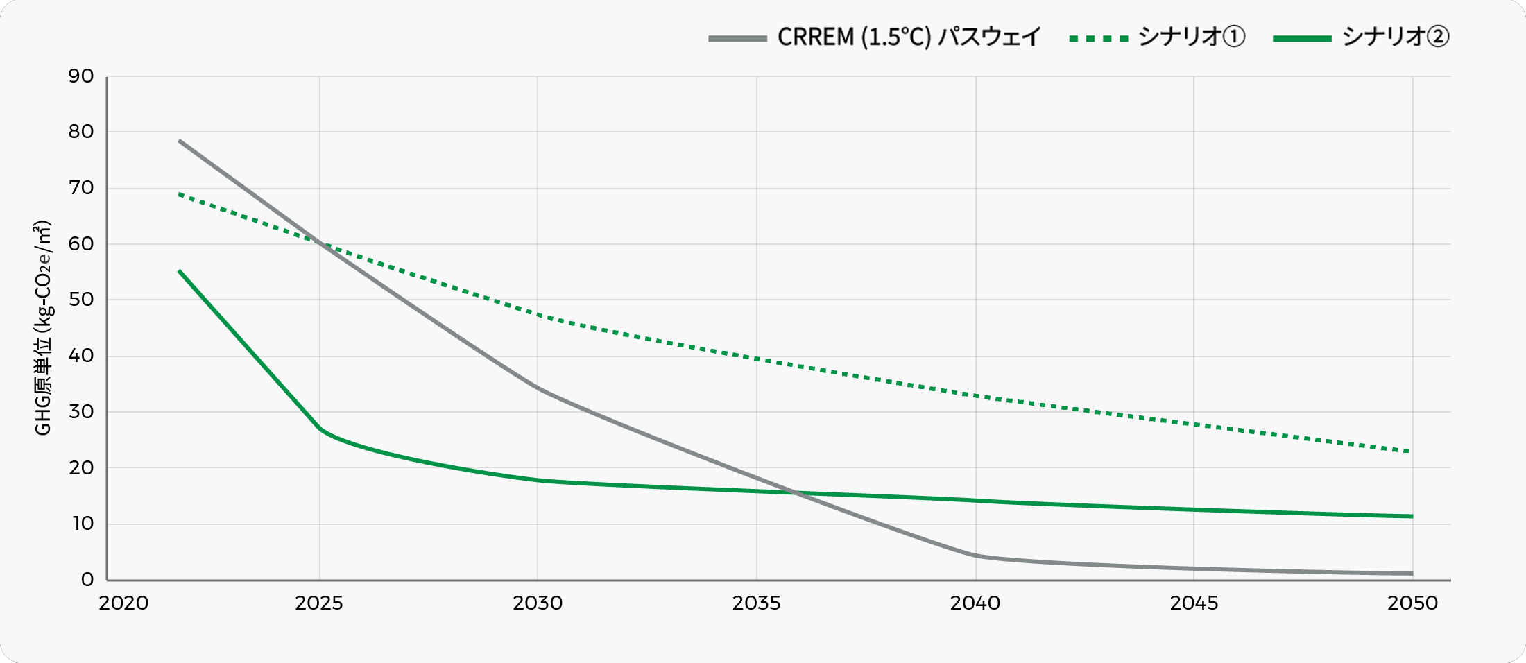 CRREMの分析手法に従い、以下の2つのシナリオについて、当社のポートフォリオのGHG排出経路とCRREMの1.5℃目標に整合する2050年までのパスウェイとを比較しています。